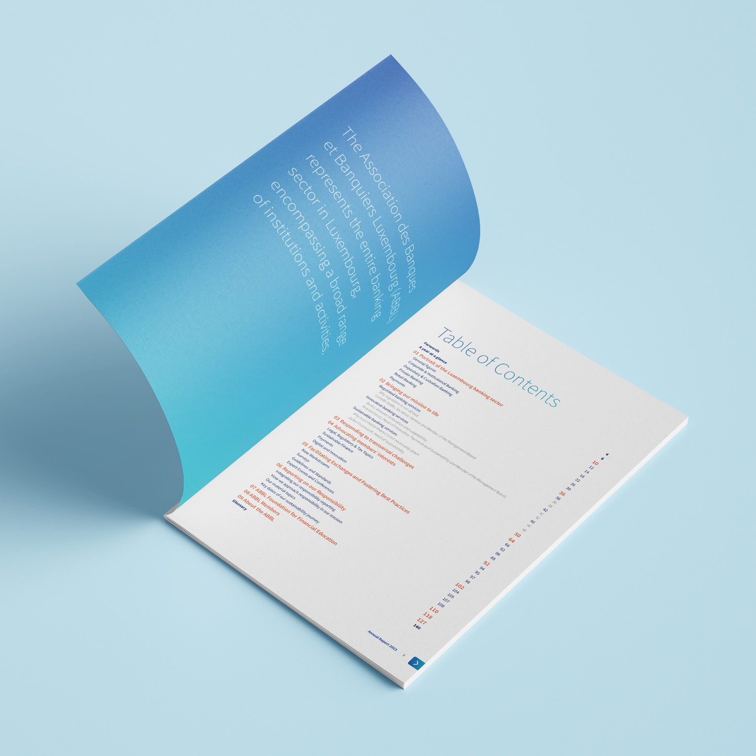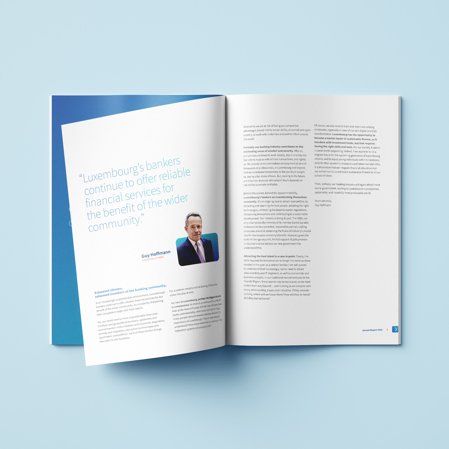 L’ABBL, l’association des Banques et Banquiers Luxembourg, a su faire confiance aux compétences de nos équipe en charge de la direction artistique et de la production pour la réalisation de son Rapport Annuel 2023.