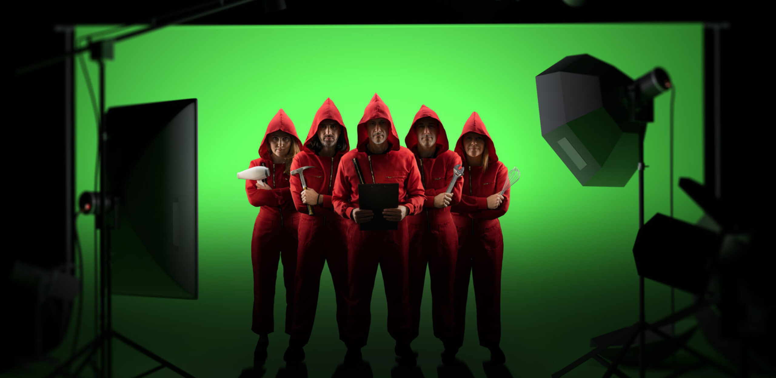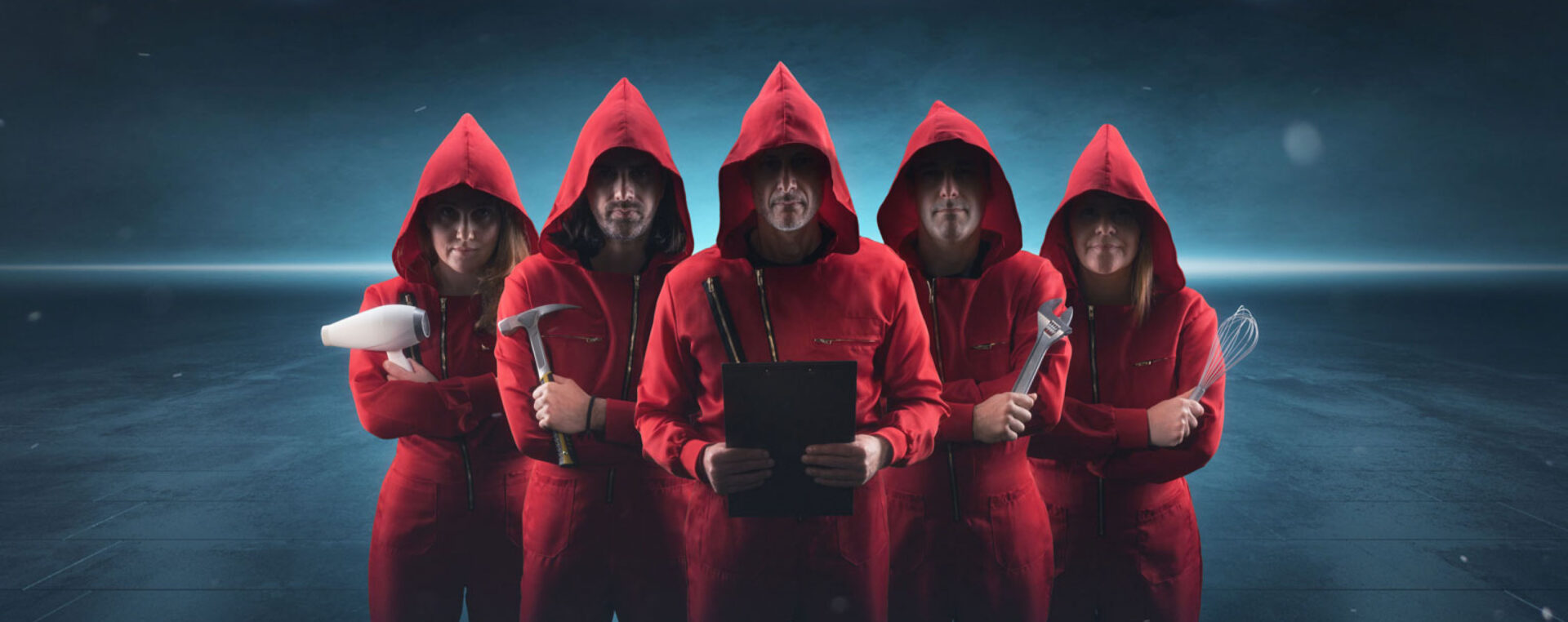 La référence à la série Casa del Papel nous permettait non seulement de représenter différents corps de métiers via des personnes seules et en groupe, mais également de créer une référence visuelle immédiate et évidente avec peu d’éléments, c’est-à-dire un simple costume rouge à capuche, une posture et une typographie.
