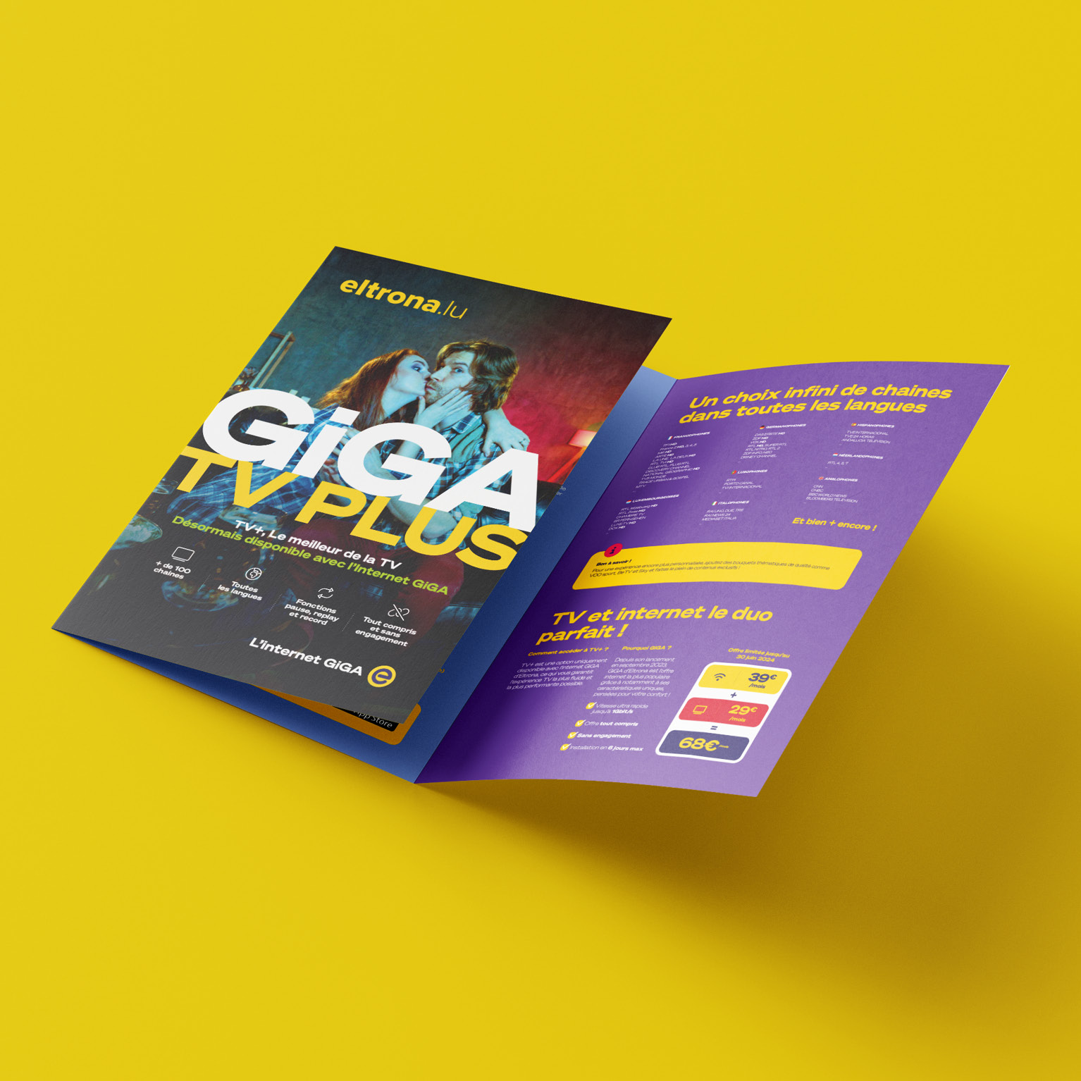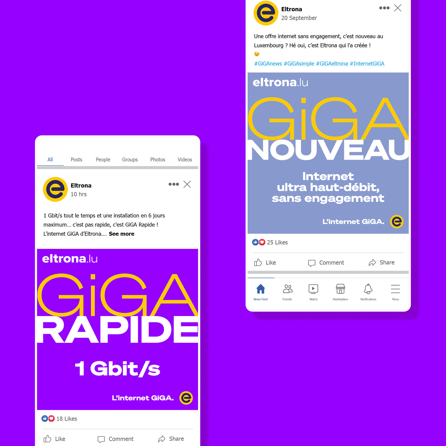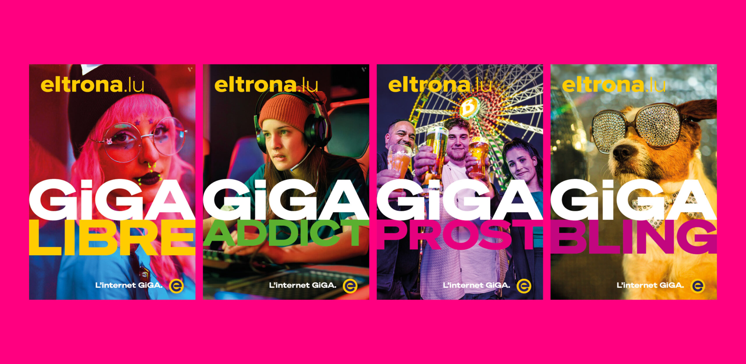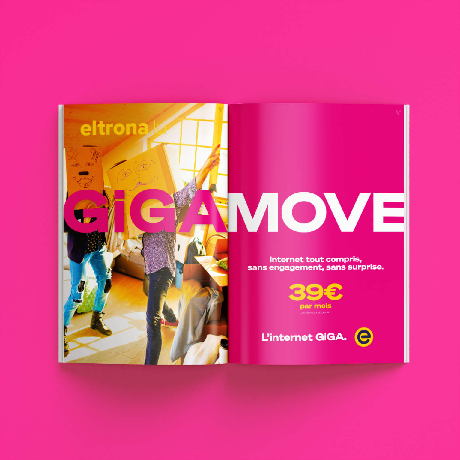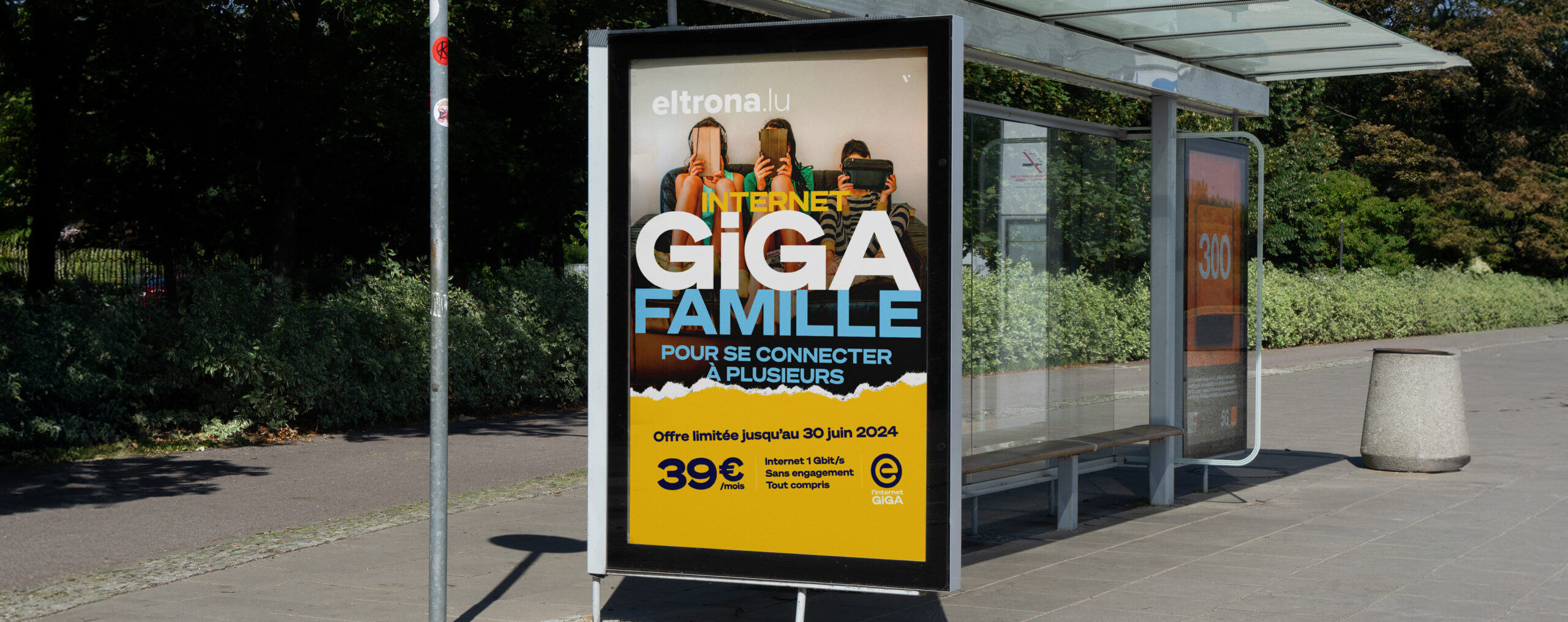Le concept de la campagne repose sur le mot « GiGA », un terme puissant et simple qui incarne l’offre Internet à 1 Gbit/s d’Eltrona et sert de fil rouge tout au long de la communication. Cet élément fort, évoquant aussi bien la vitesse, la performance et la simplicité, souligne l’engagement de la marque à offrir des solutions ultra-rapides et accessibles. En intégrant « GiGA » dans tous les messages, nous renforçons la reconnaissance d’Eltrona et affirmons sa position de leader en matière d’innovation technologique.
