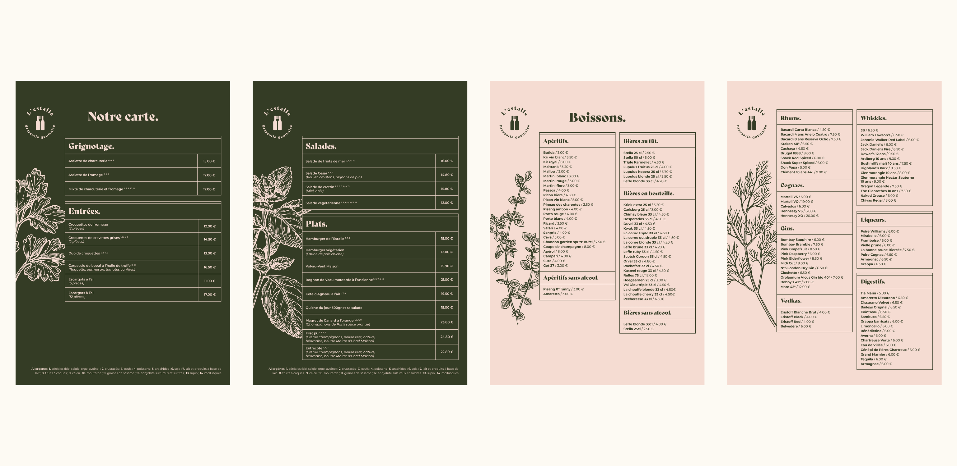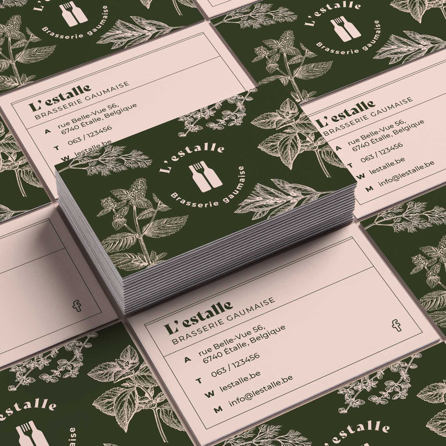 Le restaurant l’Estalle, situé à Étalle en Belgique, propose une cuisine de terroir simple et savoureuse dans un cadre unique et raffiné (bois, métal, carrelages retro, cuir). Nous avons été en charge de la création de son logo, de son branding, de son site web et de tous les éléments appartenant à son univers graphique : la décoration, les menus ou encore la vitrophanie en partenariat avec l’architecte d’intérieur du lieu.