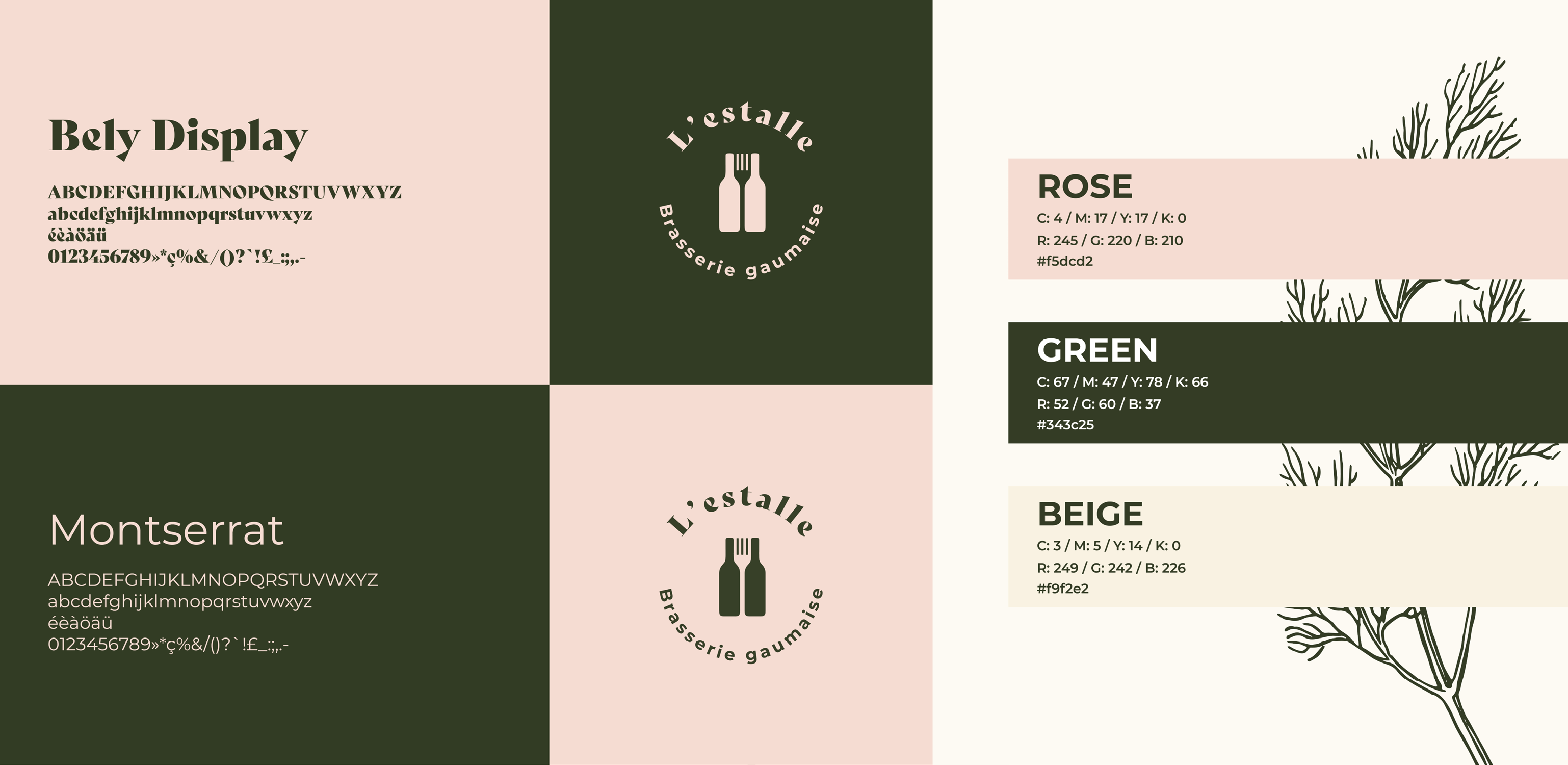 La couleur verte, contrebalancée par un rose plus léger et plus subtil, permet d’évoquer la nature, les forêts et les ingrédients du terroir. Le mariage des deux teintes offre une reconnaissance immédiate et crée un univers moderne parsemé de tradition.