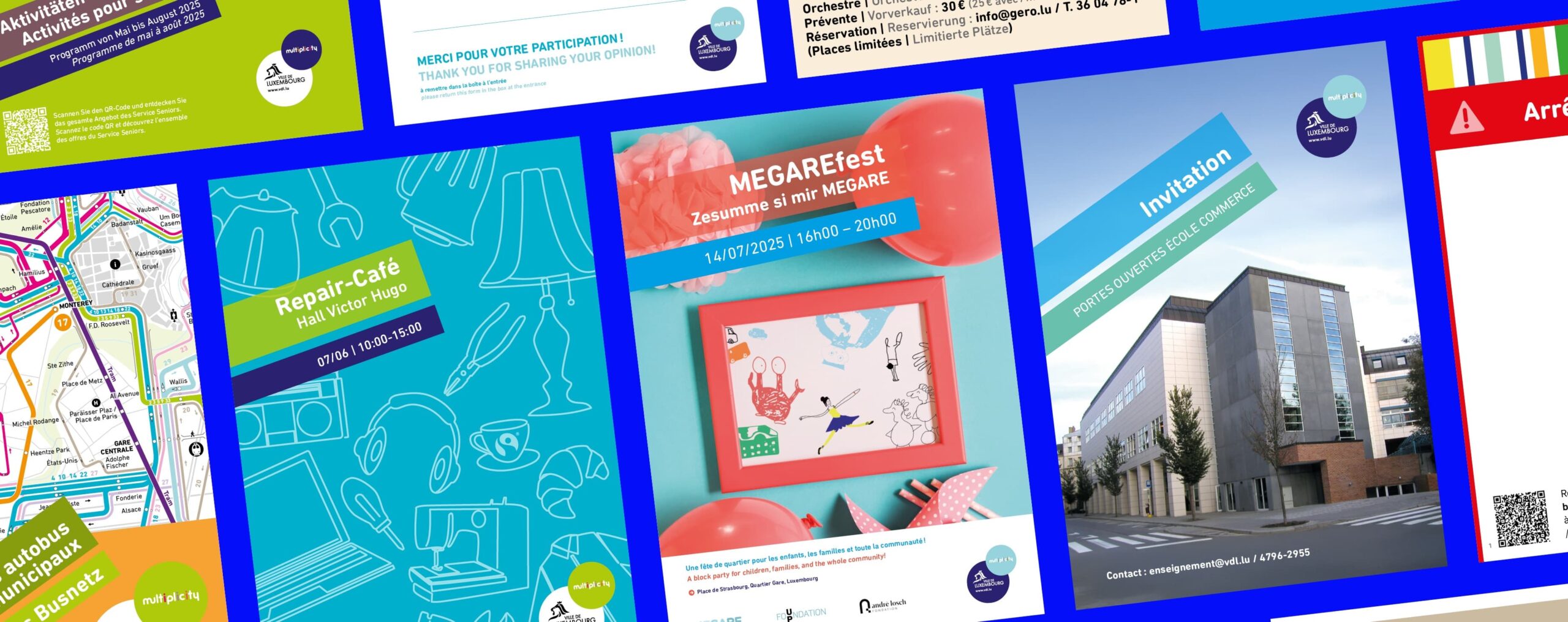 Informer les habitants, annoncer un événement, valoriser une initiative… Les supports de communication de la Ville de Luxembourg répondent à de multiples objectifs. VOUS Agency assure la conception graphique et la mise en page de ces outils, en respectant la charte visuelle de la Ville et en garantissant une qualité homogène, quel que soit le format.